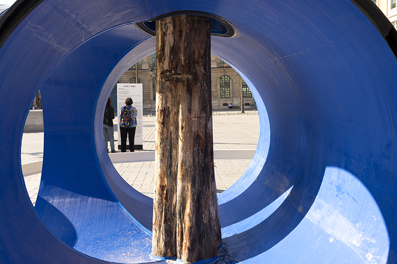 Pipelines for people, large diameter plastic pipes that you can walk through. In each of the sections of pipe you will see the trunk of a tree. Touch the tree, spend some time there. Sculptures that make a place, a series of spaces for people.
